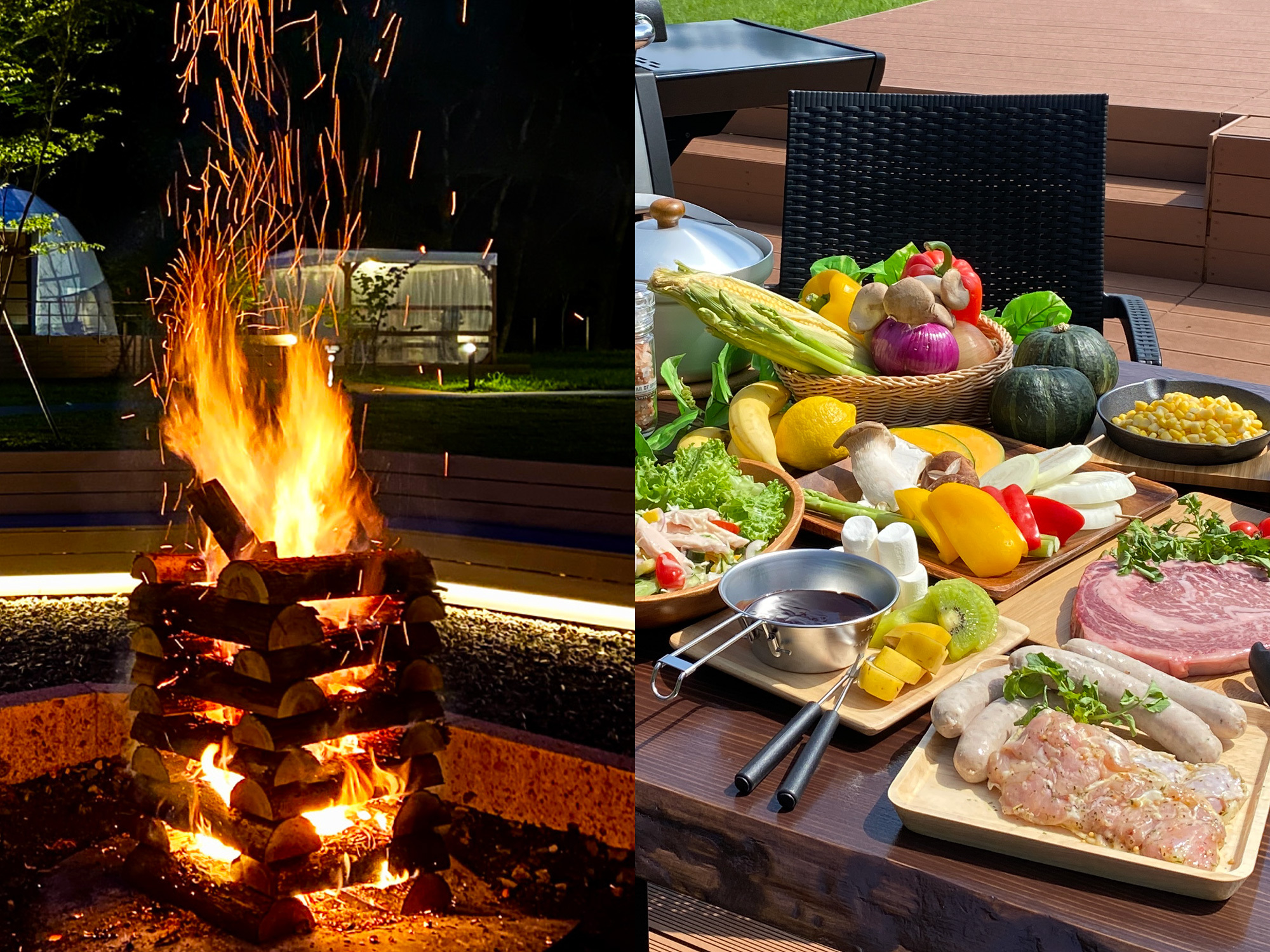 夕食は「霧降高原牛」や「日光HIMITSU豚」など地元栃木の厳選食材を使用した豪華BBQをご堪能いただけます。食後はパチパチと爆ぜるキャンプファイヤーの炎に癒やされる、グランピングならではの特別な夜をお約束します。
