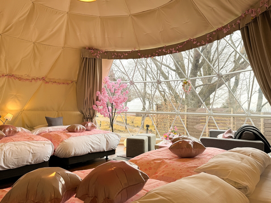 そんな毎年のお悩みを解決すべく、当施設では天候や外の開花状況に一切左右されない「インドアお花見」をご提案します。エアコン完備の快適なドームテント内で、いつでも満開の桜に包まれる非日常の宿泊体験を提供いたします。