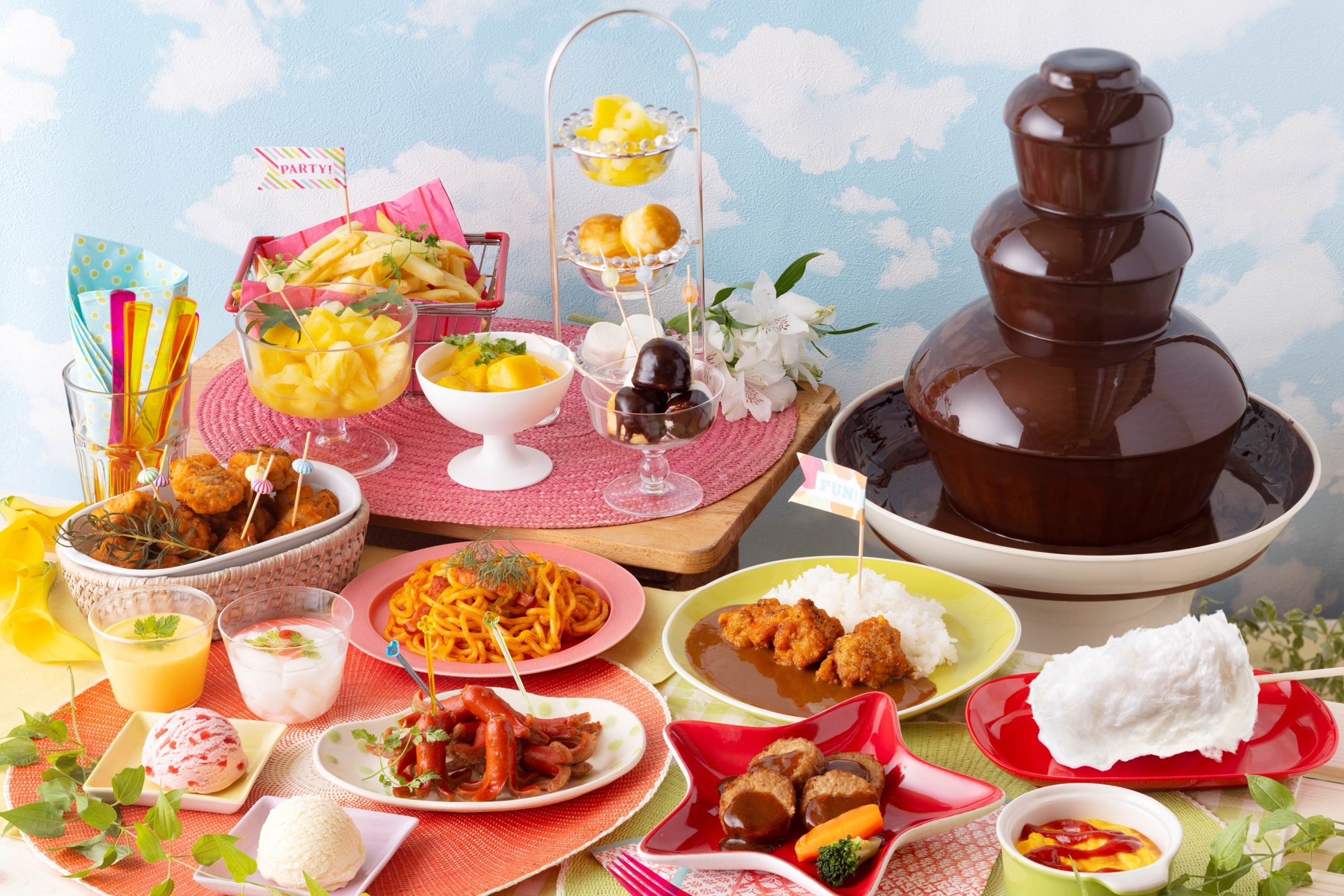 お子様が笑顔になるメニューを豊富にご用意しました!みんな大好きなたこちゃんウインナーやフライドポテト、からあげなど、わくわくするメニューが盛りだくさんです。デザートにはチョコファウンテンにフルーツやマシュマロをたっぷりとつけてお召し上がりください。