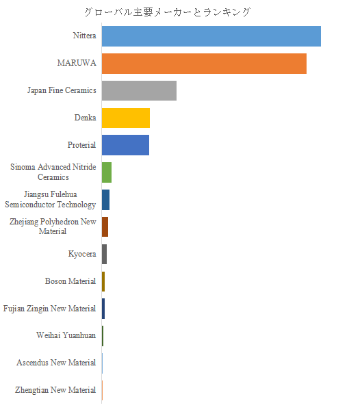 グローバル市場では、日本企業が引き続き優位なポジションを占めている。Nitteraがトップシェアを維持し、高純度粉末から焼結技術までの一貫体制によって市場をリードしている。次いでMARUWA、Japan Fine Ceramics、Denka、Proterial(旧日立金属)などが続き、高品質・高信頼のブランドを背景に自動車OEMやパワーモジュールメーカーとの長期供給契約を拡大している。一方、中国勢のSinoma Advanced Nitride Ceramics、Jiangsu Fulehua Semiconductor Technology、Zhejiang Polyhedron New Materialなどが急成長しており、低コスト製造や地域供給網の強化を武器にシェアを拡大中である。また、KyoceraやBoson Material、Fujian Zingin New Materialなどが特定用途向けに独自技術を展開し、各社は高熱伝導・低欠陥率・薄型化技術の開発競争を繰り広げている。グローバル市場全体は、品質信頼性を軸とした日系リーダーと、コスト優位性を武器に急成長する中華圏勢との「二極化競争構造」に突入している。