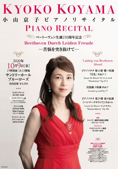 小山京子ピアノリサイタル 「ベートーヴェン生誕250周年記念 ―苦悩を突き抜けて―」 10月9日(金)サントリーホール ブルーローズにて開催