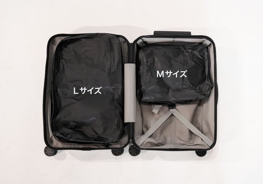 機内持ち込みスーツケースやビジネスリュックに隙間なく収まる2サイズ展開。