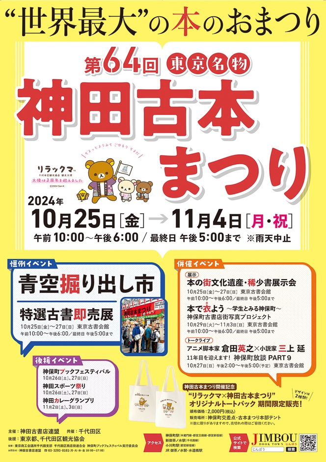 恒例の“青空掘り出し市”や“特選古書即売展”に加え、期間中「リラックマ」とコラボしたオリジナルトートバッグの限定販売や神保町古書店街をテーマとした展示会、最新版『JIMBOCHO古書店MAP』の無料配布など複数のイベントが併催され、例年以上の盛り上がりが期待されます。