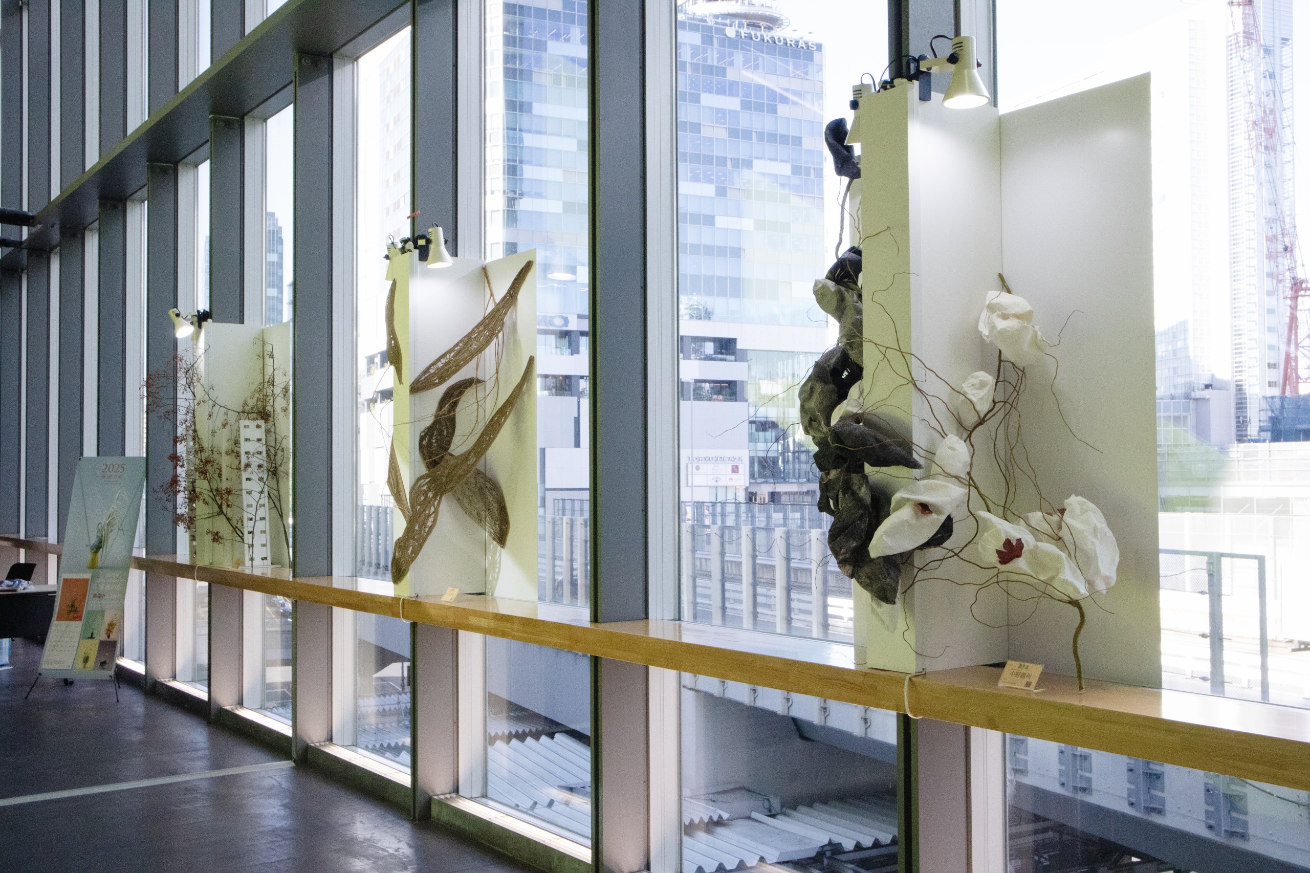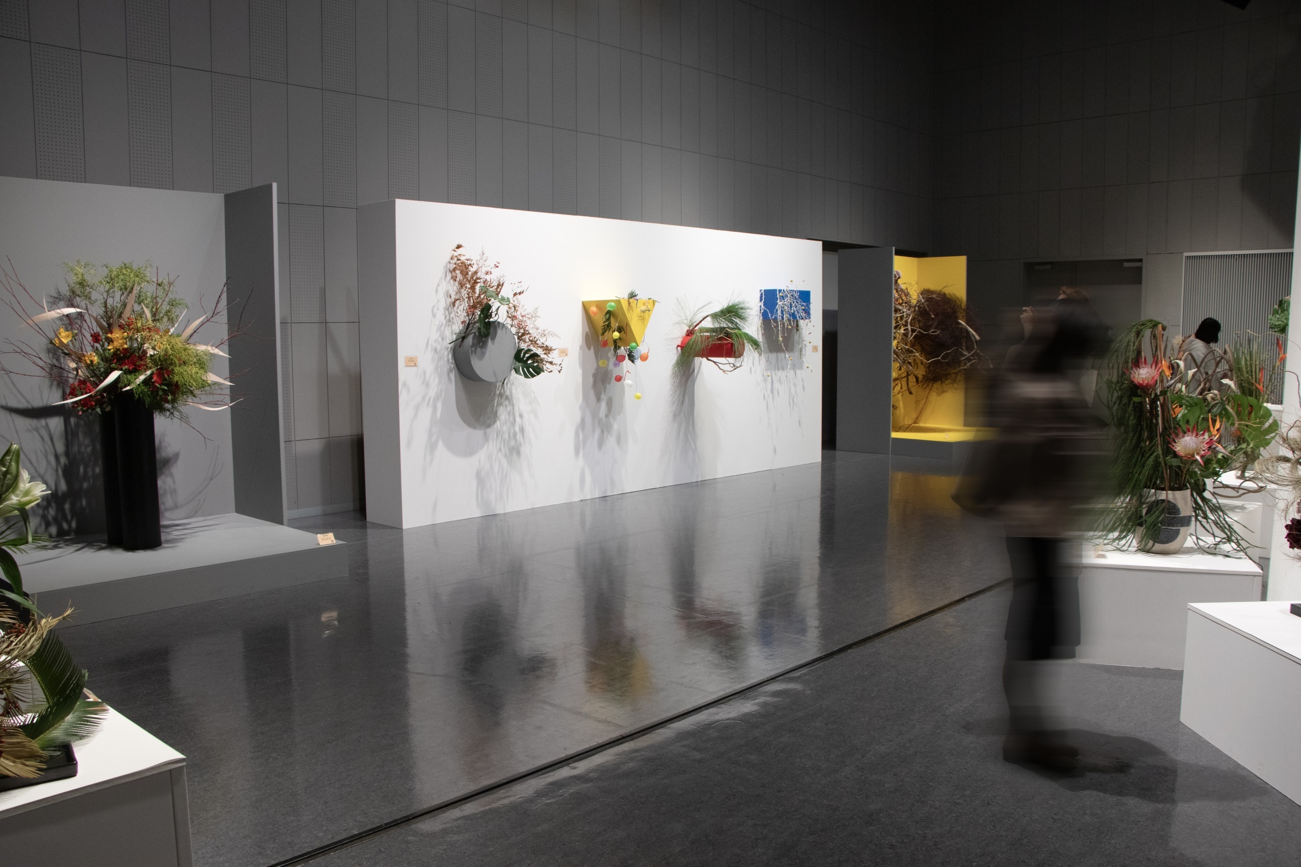龍生派のいけばな展の特徴ともいえるのが、コーナー展示。壁にかけられるパネル状の作品、窓辺を彩る作品、下からの照明の光を受けて幻想的に浮かび上がる作品、そして直径30センチ・高さ2メートルの紅白2種の柱を取り掛かりにする作品など、多様な9つのコーナーが登場します。
