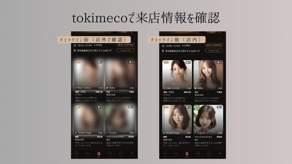 tokimecoのアプリ内では、PICROSSの店舗外にいるユーザーは来店中のユーザーの概要(性別や年齢などの特徴)を確認することができ、PICROSSにチェックインしているユーザーは来店中のユーザーの詳細プロフィール(本人画像や自己紹介など約30個の詳細な情報)を確認していただけます。