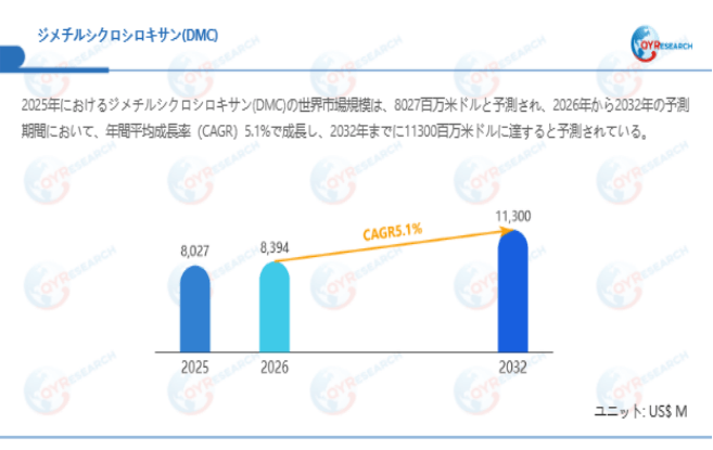 QYResearchが最新発表した「ジメチルシクロシロキサン(DMC)―グローバル市場シェアとランキング、全体の売上と需要予測、2026~2032」市場調査報告書によると、世界ジメチルシクロシロキサン(DMC)市場規模は2025年の約8027百万米ドルから2026年には8394百万米ドルへ着実に成長し、予測期間中5.1%の複合年間成長率(CAGR)で拡大を続け、2032年に11300百万米ドルに達する見込みである。