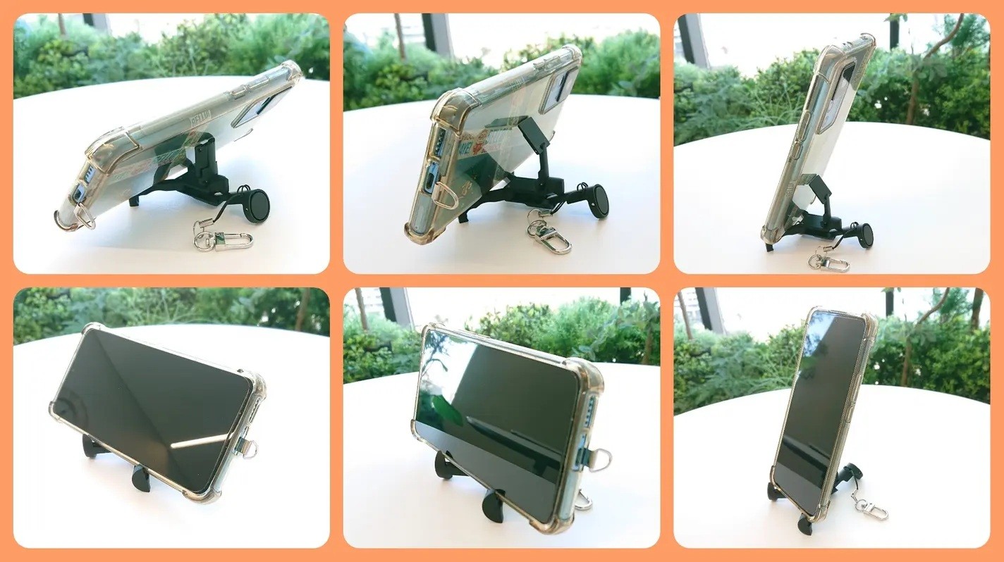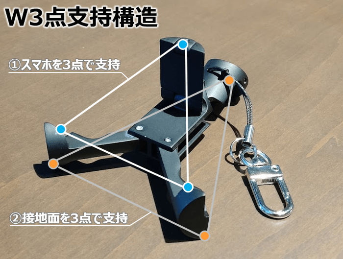 - ダブル三点支持による安定構造:接地面とスマホ支持部にそれぞれ3点支持構造を採用。不安定な場所でも抜群の安定性を実現し、あらゆるスマートフォンに対応します。(非常に厚いケースには一部非対応)