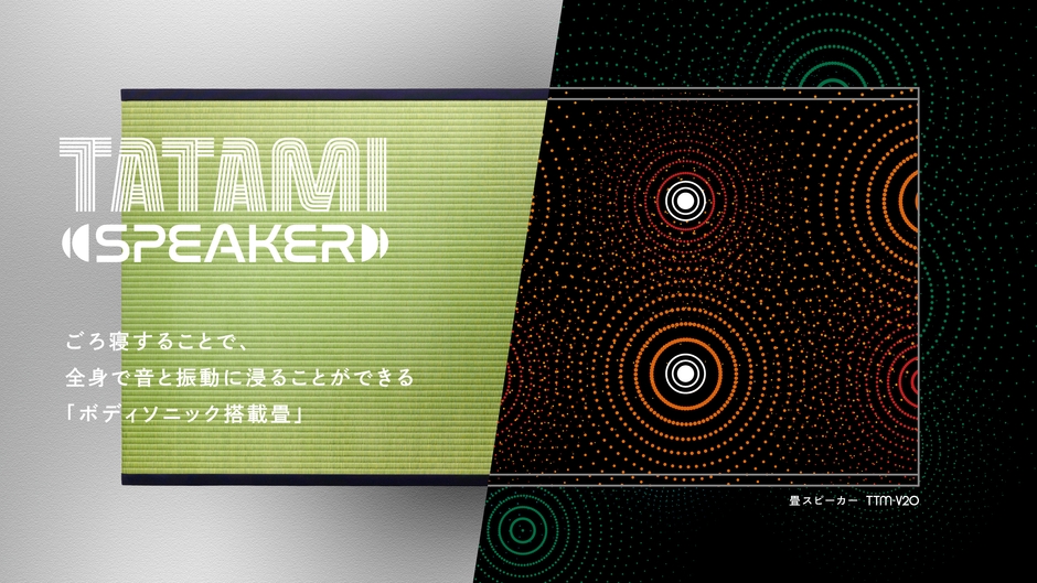 『畳スピーカー「TTM-V20」』は振動スピーカーを畳の内部に4基搭載し、畳に「ごろ寝」をすることで、全身で音と振動に浸ることができる“ボディソニック搭載畳”です。