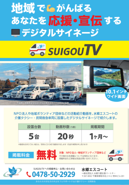 都心ではビジネスマン向けの広告として定着しているタクシーサイネージを「情報にアクセスしにくい高齢者への手助けになれば」と考案された『SUIGOU-TV』。利用者様が車いす・ストレッチャーのまま乗車できる介護タクシーや民間救急車両の中で、10.1インチのワイドモニターが出稿されたムービーを放映。「利用者様と地域で頑張る団体を応援したい」との想いからNPO、ボランティアなどの福祉関係の掲載料はすべて無料。一般企業は1台1,000円、5台月額5,000円で承ります。