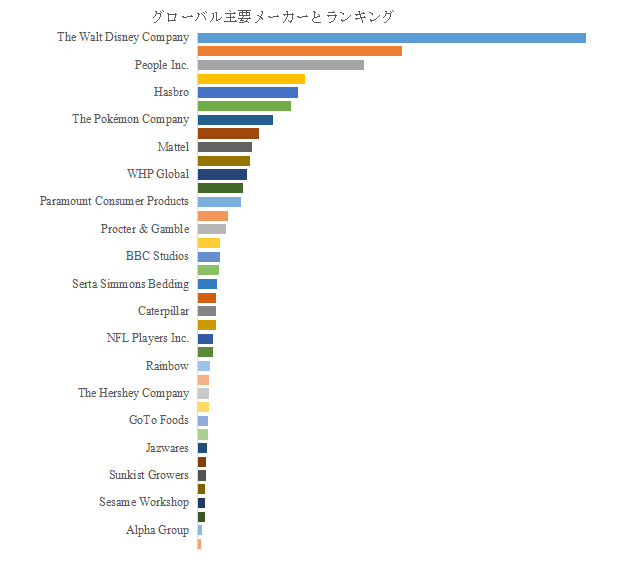 順位面では、エンターテインメントIPや著名ブランド資産を広く保有する企業が上位を形成しやすい一方、カテゴリ特化型や地域展開に強みを持つ企業にも一定の余地がある。北米主導の構図はなお強いが、グローバル市場全体では地域別・IP別・商品別の差が大きく、単純な一社独走とは言い切れない。したがって今後の競争は、保有IPの強さだけでなく、販路設計力や地域適応力を含めた総合力の勝負になりやすい。