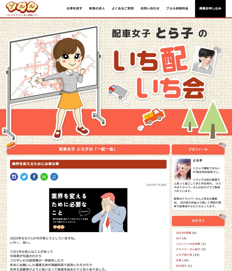 物流2024年問題や法改正など時事的な話題から、運賃交渉・人手不足など運送業界が抱える慢性的な課題まで、様々な内容を客観的に鋭く深掘り。ユーモアたっぷりかつ歯に衣着せぬとら子節ながら、物流業界で働く人々へのリスペクトを忘れない内容が共感を呼び、多くのトラックドライバーの皆様に支持されています。