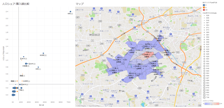 店舗の会員データを町丁目ポリゴンに取り込み、国勢調査データ(人口総数)を使ったシェア分析を実施。同時に世帯数に対する顧客シェアと購入額の関係をグラフ表示することで、会員動向の迅速な把握を実現。店舗運営の効率化と売上の拡大に向けた施策の立案をスピーディーに実施可能となります。