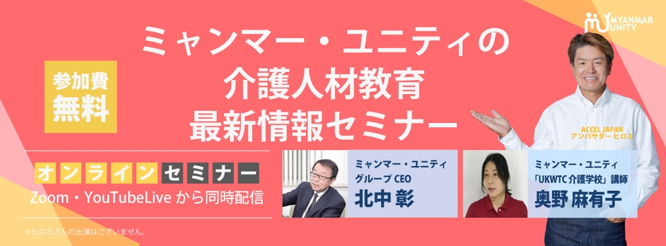 ミャンマー政府認定圧倒的No.1人材送り出し機関 「ミャンマー・ユニティ」は、2024年7月3日(水)14時に 「ミャンマー・ユニティの介護人材教育最新情報セミナー」を開催いたします。