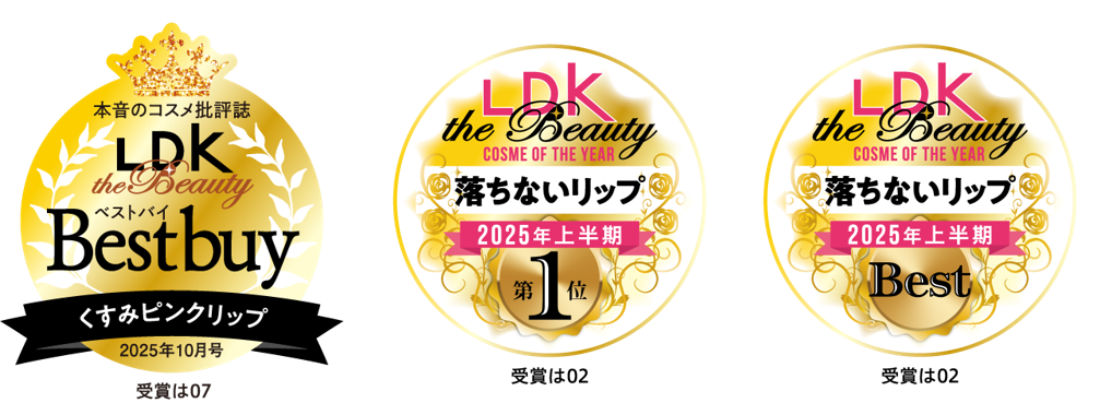 ※1 『LDK the Beauty』(株式会社普遊舎)受賞/デイジードール リップ スティーラー 02:2025年上半期ベストコスメ 落ちないリップ部門で1位、ベストバイW受賞、03:2025年3月号 深みカラーリップ部門でA評価、04:2025年4月号 ベージュリップ部門でA評価、06:2025年3月号 深みカラーリップ部門で1位、ベストバイW受賞、07:2026年1月号 くすみピンクリップ部門でベストコスメ2025受賞