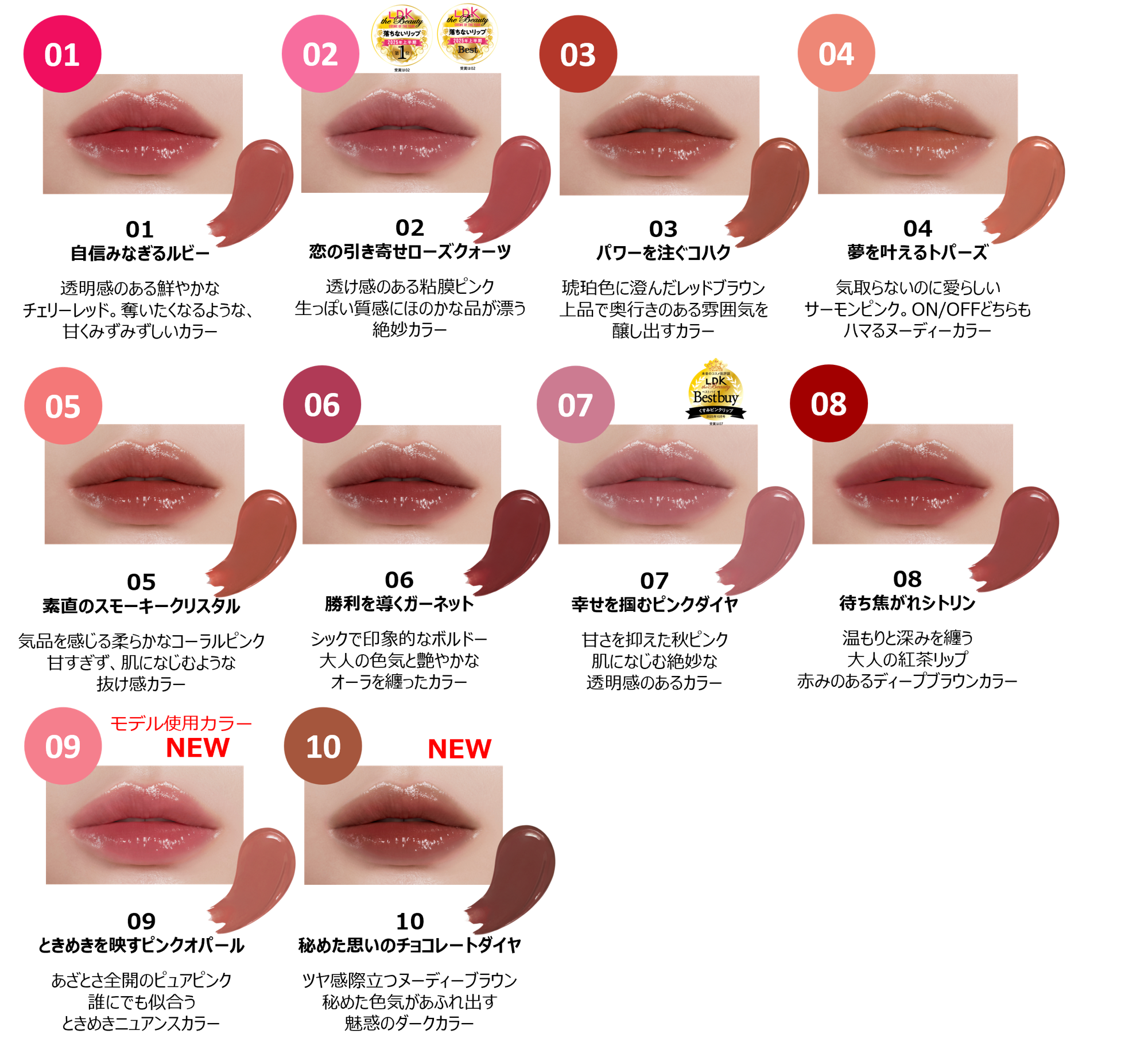 この度加わるのは、あざとさ全開で透明感あふれるピュアピンク系の「09 ときめきを映すピンクオパール」と、ツヤ感際立つ大人なヌーディーブラウン系の「10 秘めた思いのチョコレートダイヤ」の2色。