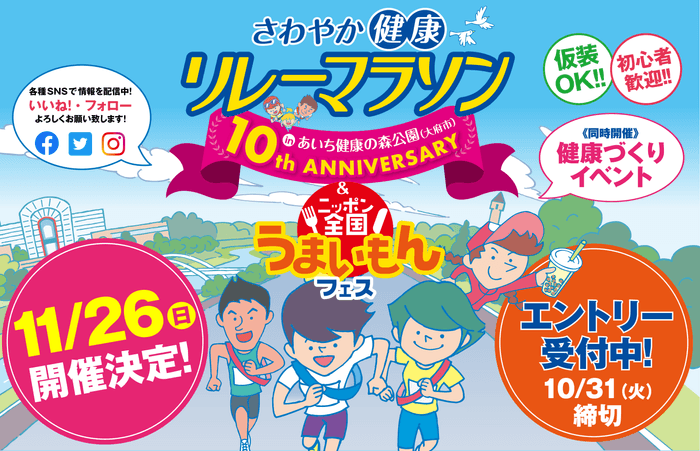「さわやか健康リレーマラソン」は、おかげさまで今年で10回目を迎えます。“タスキで繋ぎリレーマラソンを走り、達成感を共有すること”で家族や友達、会社の仲間やサークルのメンバーとのコミュニケーションを深めませんか。今年は「ニッポン全国うまいもんフェス」「健康づくりイベント」を同時開催します。