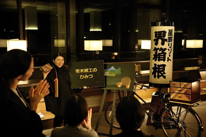 箱根は京へ向かう旅人にとって最初の難所で、旅人を癒す「茶屋文化」が盛んな地域でした。界 箱根では夕食後にその文化を再現した「寄木CHAYA」が毎夜オープンします。伝統工芸である箱根寄木細工のルーツを知るだけでなく、鑑賞し、好みの器を選び、実際に使えるのも楽しみのひとつです。季節の飲物や甘味と一緒に、旅人になった気分で夜のひとときを過ごせます。