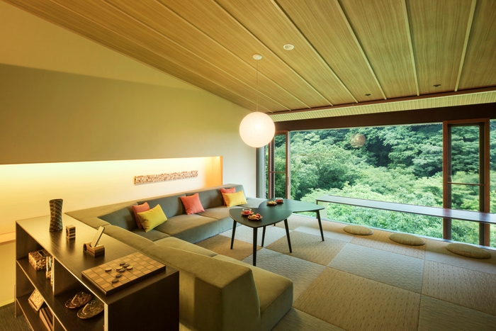 伝統的な技法と現代的な感覚を併せ持つ、箱根寄木細工の作家・露木清勝氏・清高氏親子とのコラボレーションにより完成したご当地部屋。随一の眺望を誇る最上階には、伝統工芸に囲まれておしゃべりが楽しめる「清流リビング付き和洋室」、寄木の家具と開放的なテラスで箱根の自然を独り占めできる「露天風呂付き洋室」、川のせせらぎを感じることができる「せせらぎ縁台付き和室」の3タイプがあります。