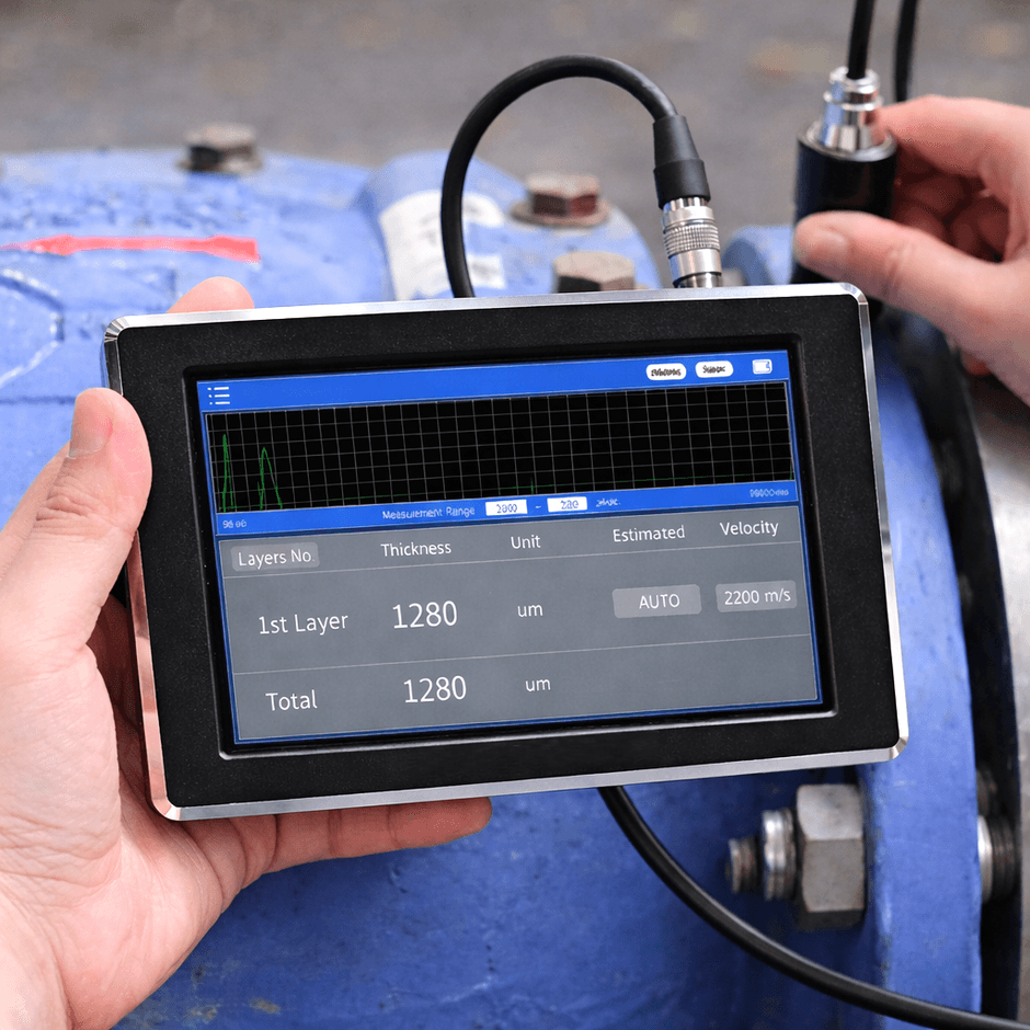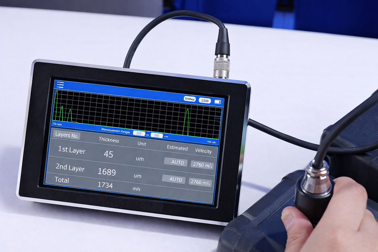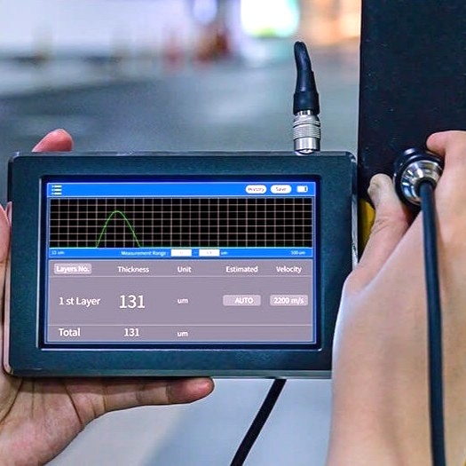 最大3層の膜厚を個別に測定できるほか、膜厚と素地(母材)の同時測定にも対応しています。測定範囲も広く、エポキシ塗料で最大5.5mm、鉄鋼材料では約15mmまでの測定が可能です。