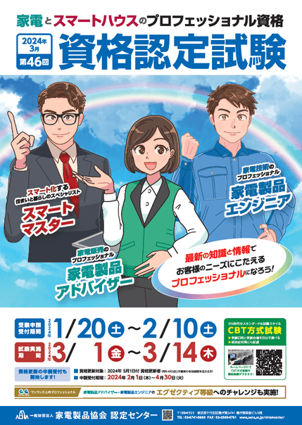 お客様のニーズに応えるプロフェッショナルになろう! 「家電製品アドバイザー」「家電製品エンジニア」 「スマートマスター」 2024年3月(第46回)資格認定試験の受験申請がスタートしました!