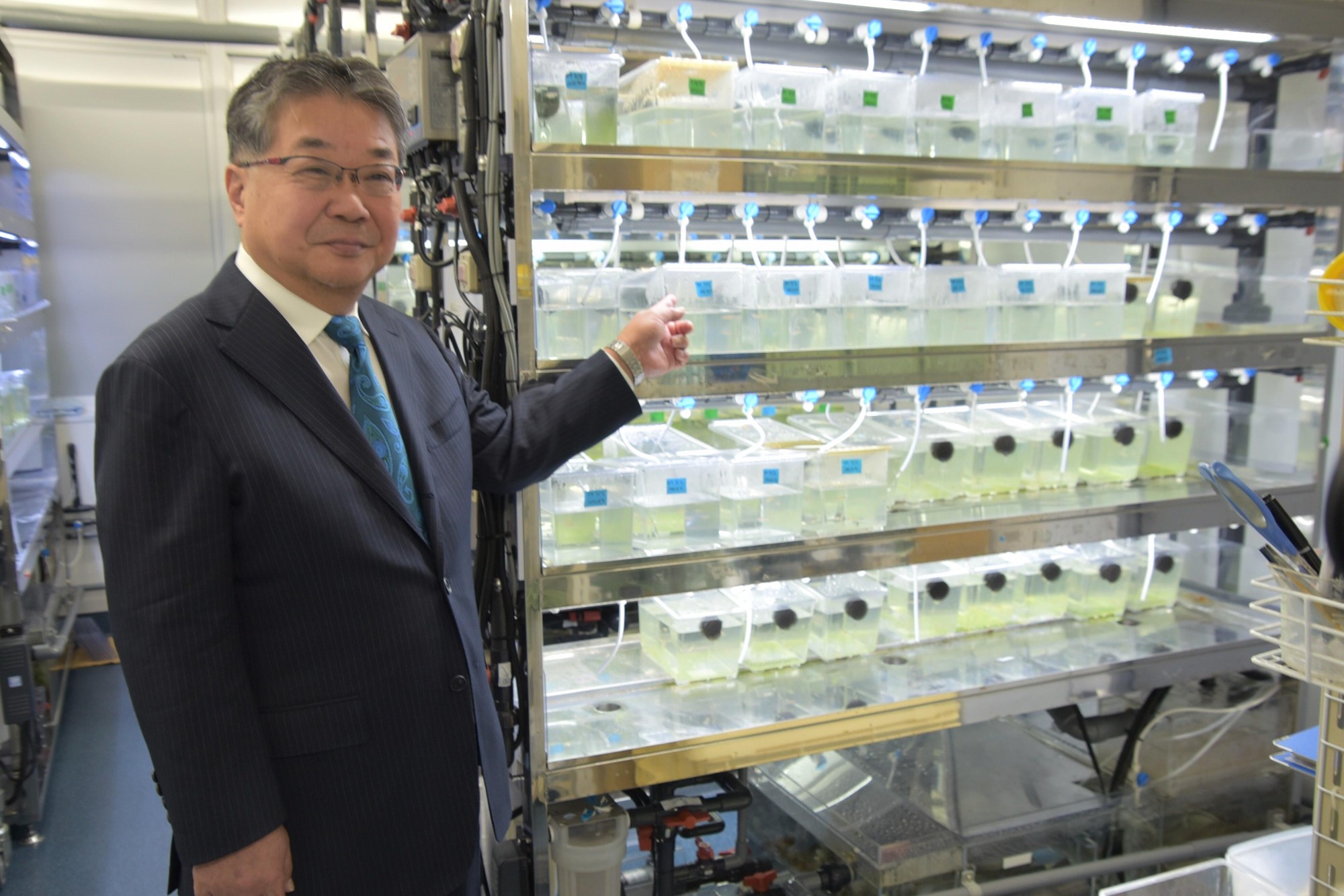 今後の具体的な研究内容については「まだまだやれることがある」と、今年で研究着手から38年目という「小胞体ストレス応答」が中心となり、「薬学部なので治療や医療などの応用面も取り組みやすくなる」と期待しました。会見後、その研究の拠点となる細胞生物学研究室に移動。京都大学から異動してきた齊藤峻介助教と陳炳碩助教とともに、心不全などさまざまな疾患の遺伝子を持つメダカ3000~4000匹が飼育されている水槽が並ぶ部屋や細胞の培養室などを案内しました。