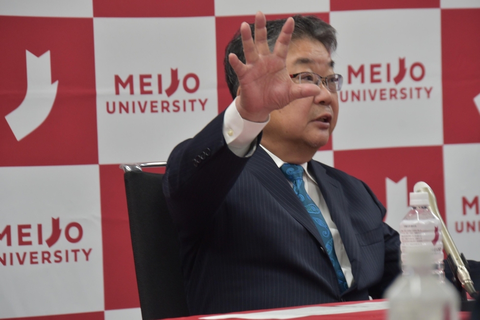続いて、森教授が「京都大学に27年いましたが、熱心にお誘いいただいたので、この4月からこちらでお世話になることになりました。よろしくお願いします」とあいさつ。記者からの質疑応答に入り、まず名城大学の印象を聞かれると、森教授は「規模が大きな大学で、薬学部の学生も人数が非常に多い。元気が良く、礼儀正しい学生ばかりで、きちんとあいさつをしてくれます」と笑顔で答えました。