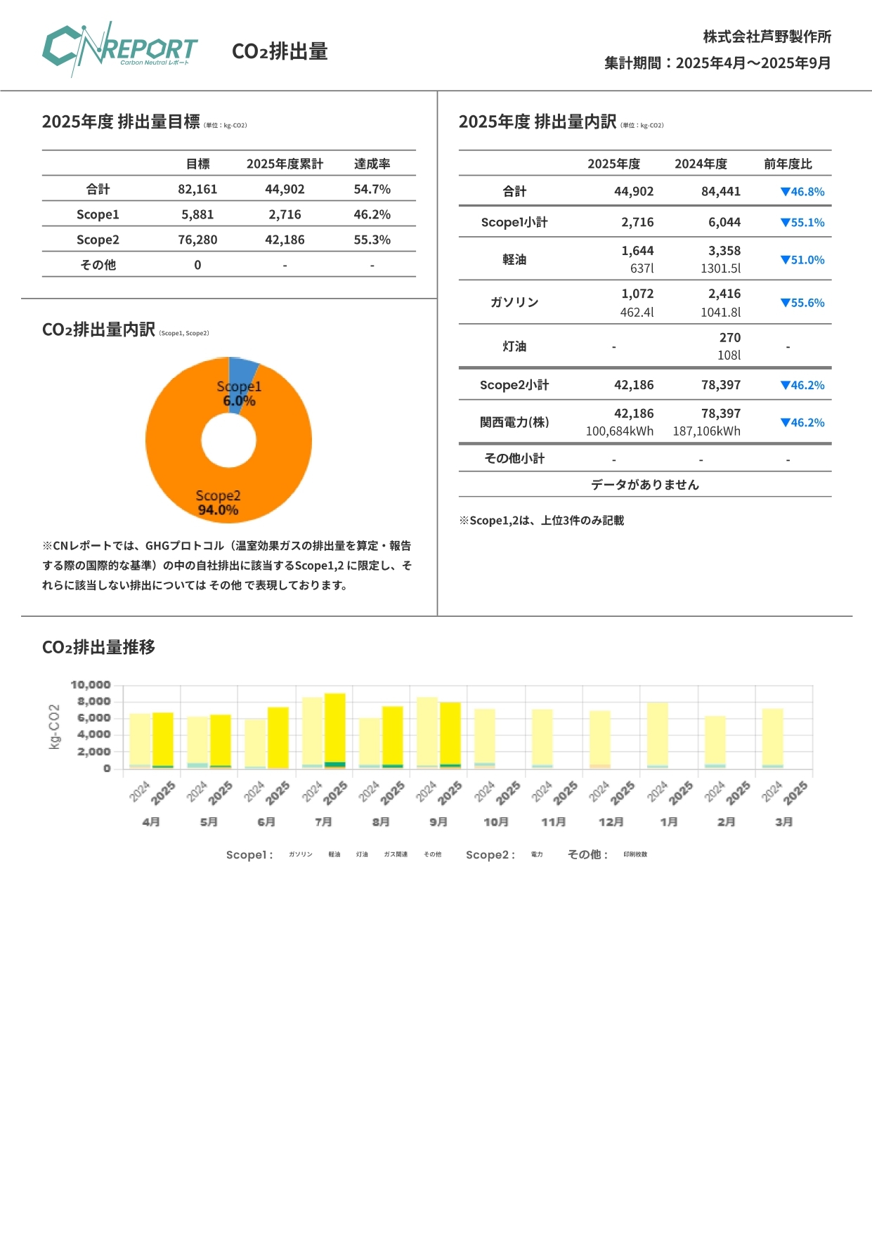 ・GHG排出量(Scope1-2)の見える化と月次レビュー(CNレポート)、再生可能エネルギーの導入で環境対応を継続的に改善、前年対比で排出量2%削減を目指す