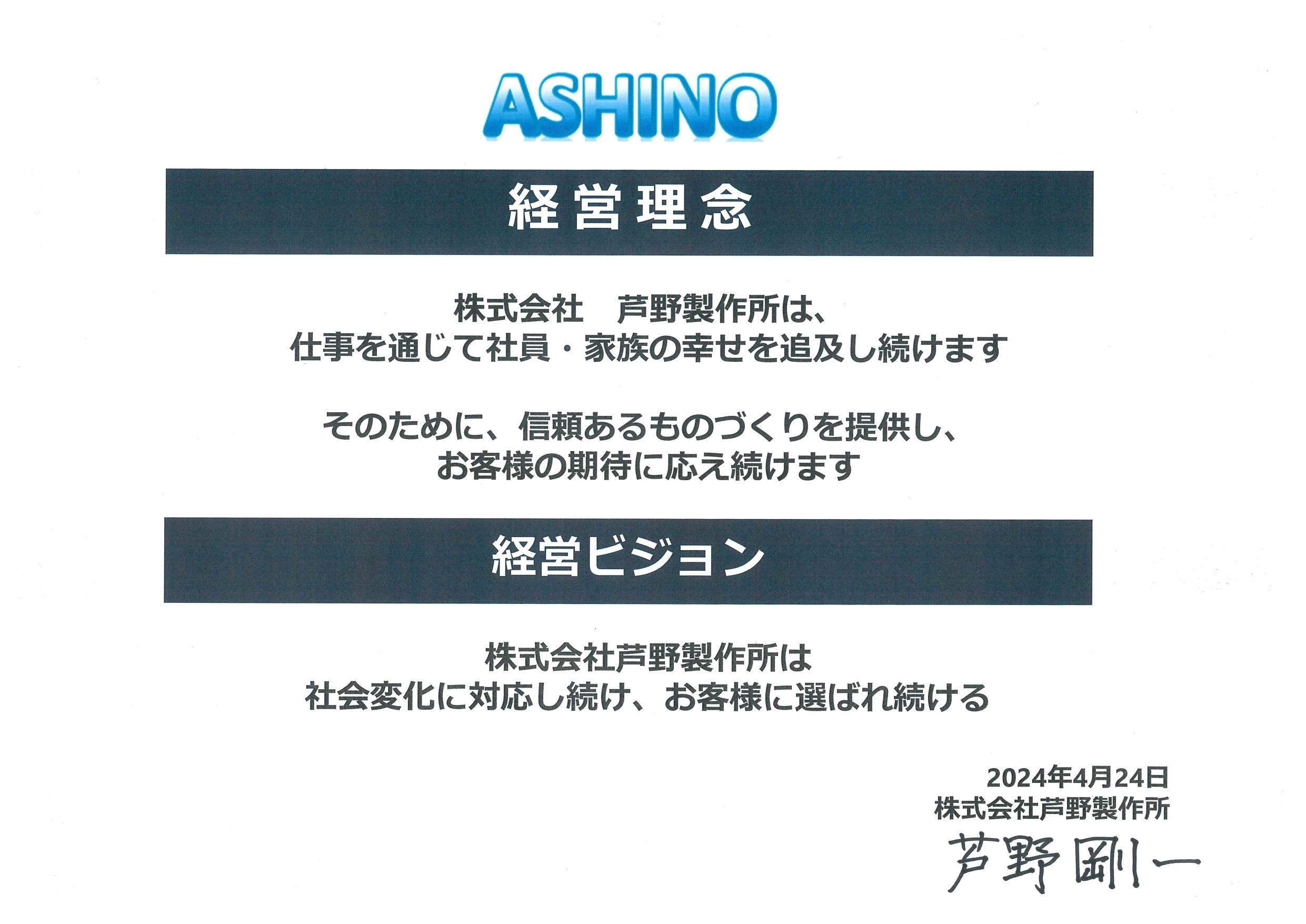 「私たちの仕事は、人の暮らしを支える社会インフラに直結しています。だからこそ、若手が安全に学び続け、取引先が安心して任せられる体制を築き、従業員一人ひとりが責任を果たし互いに助け合う。地域に誇れる工場であり続けることを、ここに約束します。」