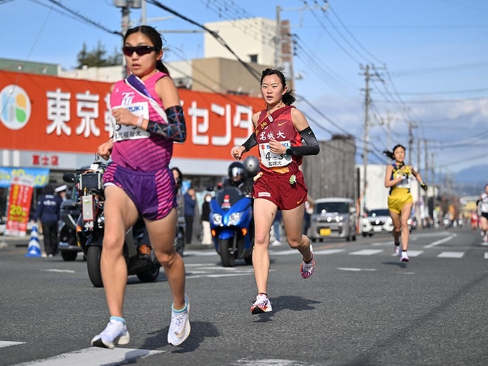 首位争いは白熱し、立命館大学の福永楓花選手(4年)が区間新記録(19分12秒)となる区間1位の快走でトップを奪い返した。日本体育大学の嶋田桃子選手(4年)も従来の区間記録を上回る19分23秒でチームを2位に押し上げる。両校の差は6秒。大東文化大学がさらに43秒差でそれに続き、勝負は最終区間へ。名城大学はこの区間終了時点でトップから3分18秒差の7位となった。