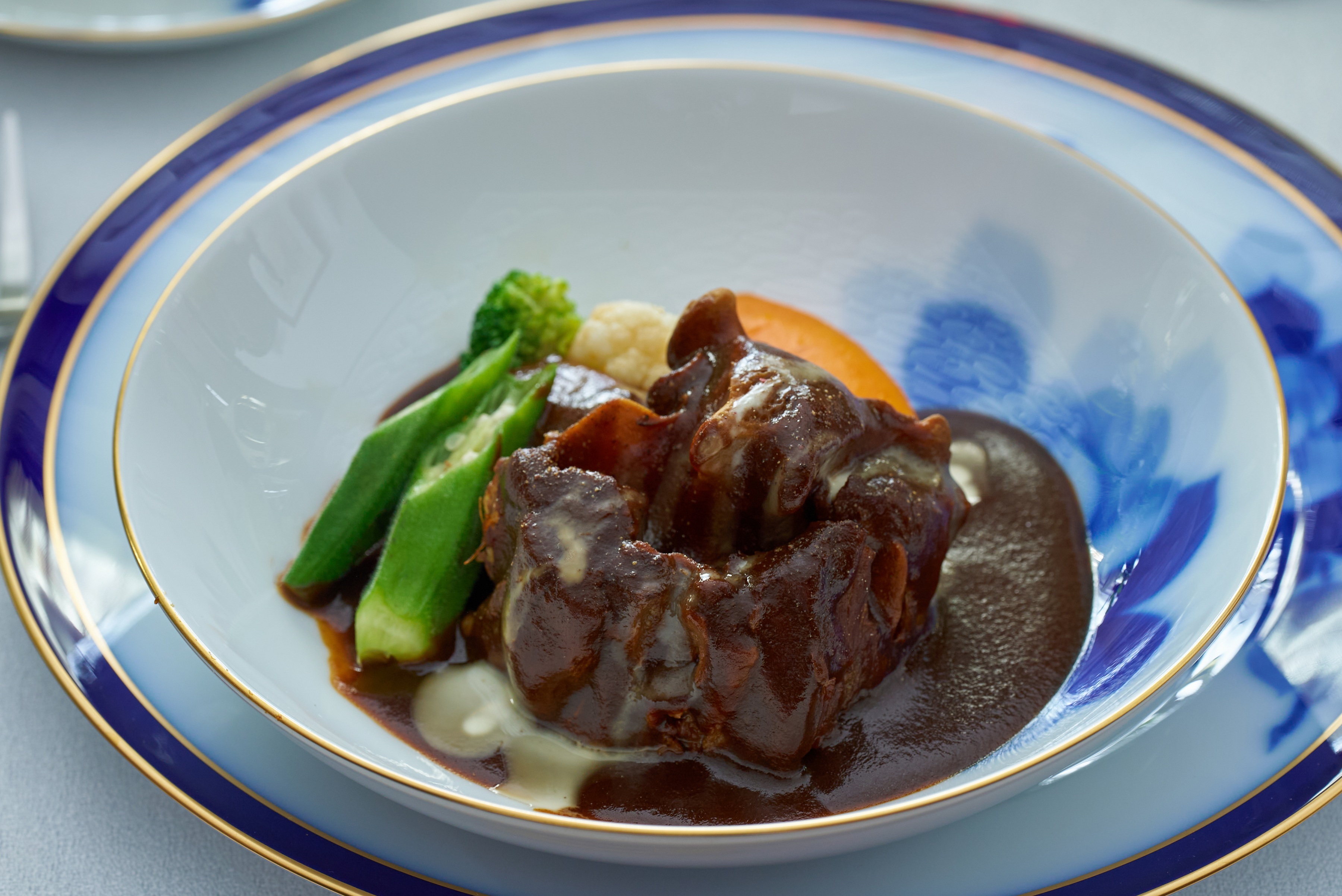 メニュー一例: 牛テールの赤ワイン煮、有機野菜のロワイヤルサラダ、季節のスープ ほか