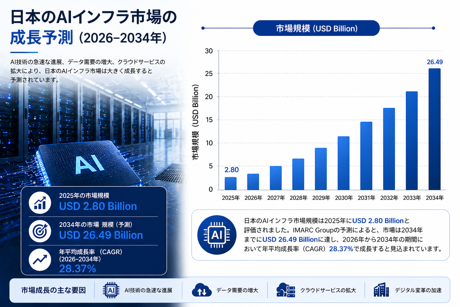 日本のAIインフラ市場は2025年に28億米ドルに達し、2034年には264億9000万米ドルに達すると予測されており、2026年から2034年にかけて年平均成長率(CAGR)28.37%で成長すると見込まれています。