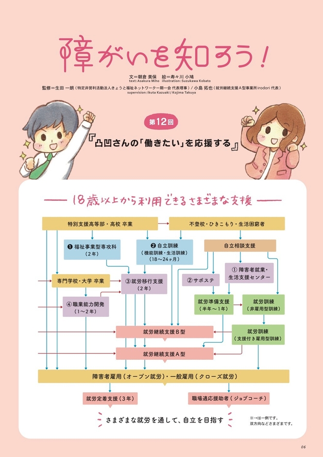 1~4号ではいろんな障害の特集を、5~7号では発達障害のASD、ADHD、SLDを、8~10号ではライフステージでの特集を、11号では療育特集をお届けしてきました。今回の12号では療育(児童発達支援)後の支援、つまり「18歳から利用できる就労や自立に向けた支援」について特集しています。