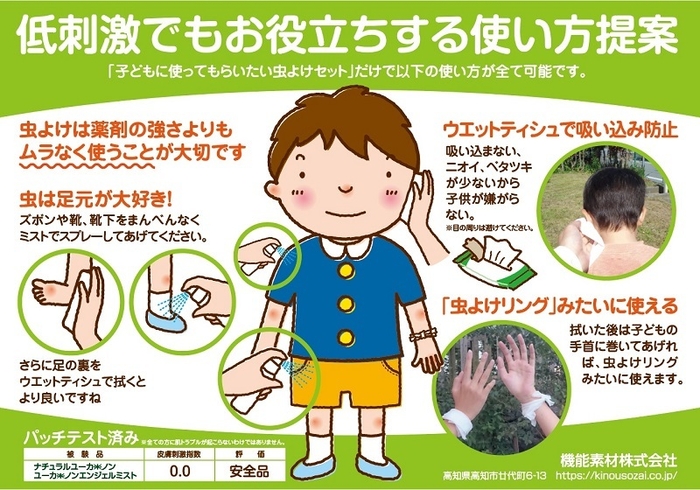 機能素材株式会社(所在地:高知県高知市、代表取締役社長:岡村 岳尚)は、ディート無添加虫よけ入りウエットティシュとミストが両方入った「子どもに使ってもらいたい虫よけセット」をお試し価格(最大50%OFF)で発売しました。