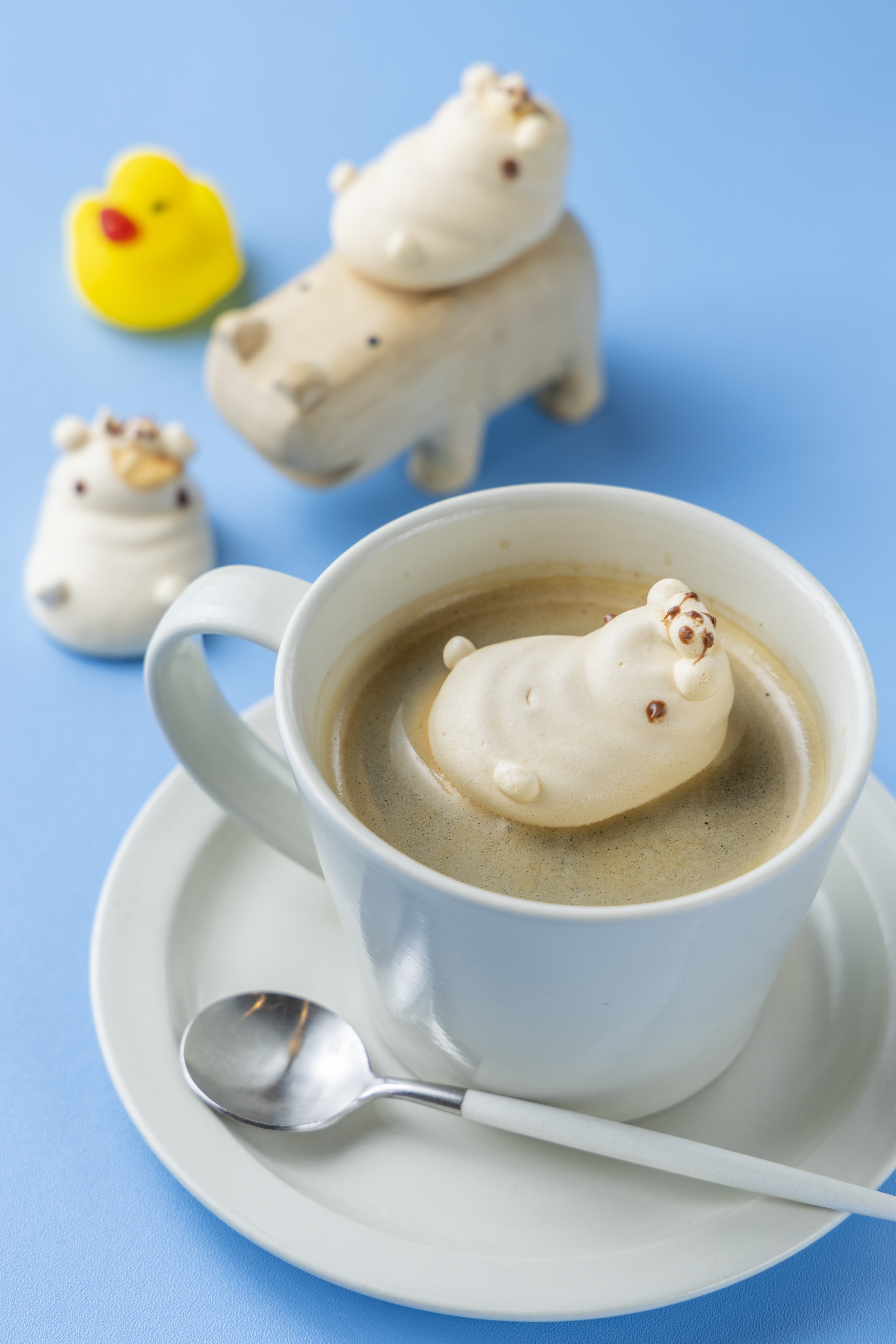 いい風呂の日WEEKの期間中、ホットドリンクを注文するとメレンゲでできたかばさんがトッピング!かばさんはかわいく甘いだけでなく、レモン果汁を加えて美味しく仕上げました。ホットドリンクにぷかぷか浮いているかばさんと一緒に可愛い写真を撮りましょう!