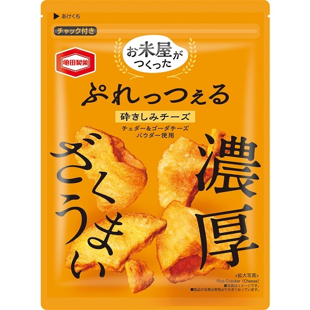 『お米屋がつくった ぷれっつぇるチーズ』は、独自の米菓製法を用いて、中までたっぷりと味をしみ込ませた濃厚な味わいとざくざく食感の“ぷれっつぇる”です。焼き上げた堅焼せんべいをあえて細かく不揃いに砕き、砕いた生地をチェダーチーズとゴーダチーズをベースにした濃厚チーズソースの中へどっぷりと漬け込むことで、生地の断面や空洞の中にまでたっぷりと味がしみ込んだ驚きの濃厚感を実現しました。ざくざくとした食べ心地でとまらない美味しさです。