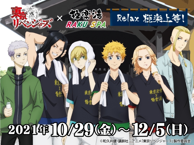 株式会社極楽湯(本社:東京都千代田区、代表取締役社長:新川隆丈)は、2021年10月29日(金)より極楽湯・RAKU SPAグループ19店舗で、TVアニメ『東京リベンジャーズ』とのコラボレーションキャンペーン「Relax 極楽上等!」を開催いたします。