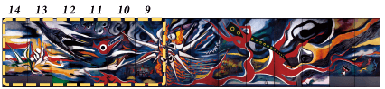 全14枚のうち、壁画左側部分の6枚(右側から9~14枚目)の亀裂・剥落・変色などを修復し、一昨年よりスタートした大規模改修は今回にて完了いたします。