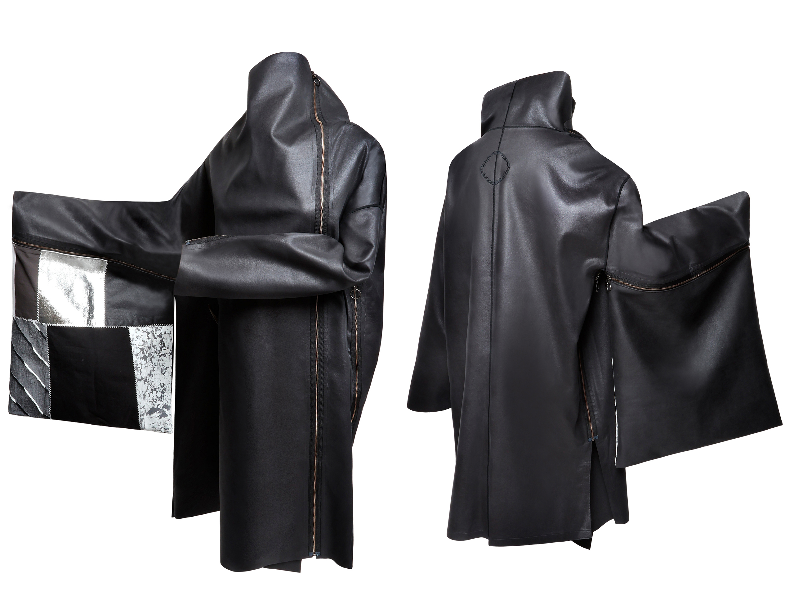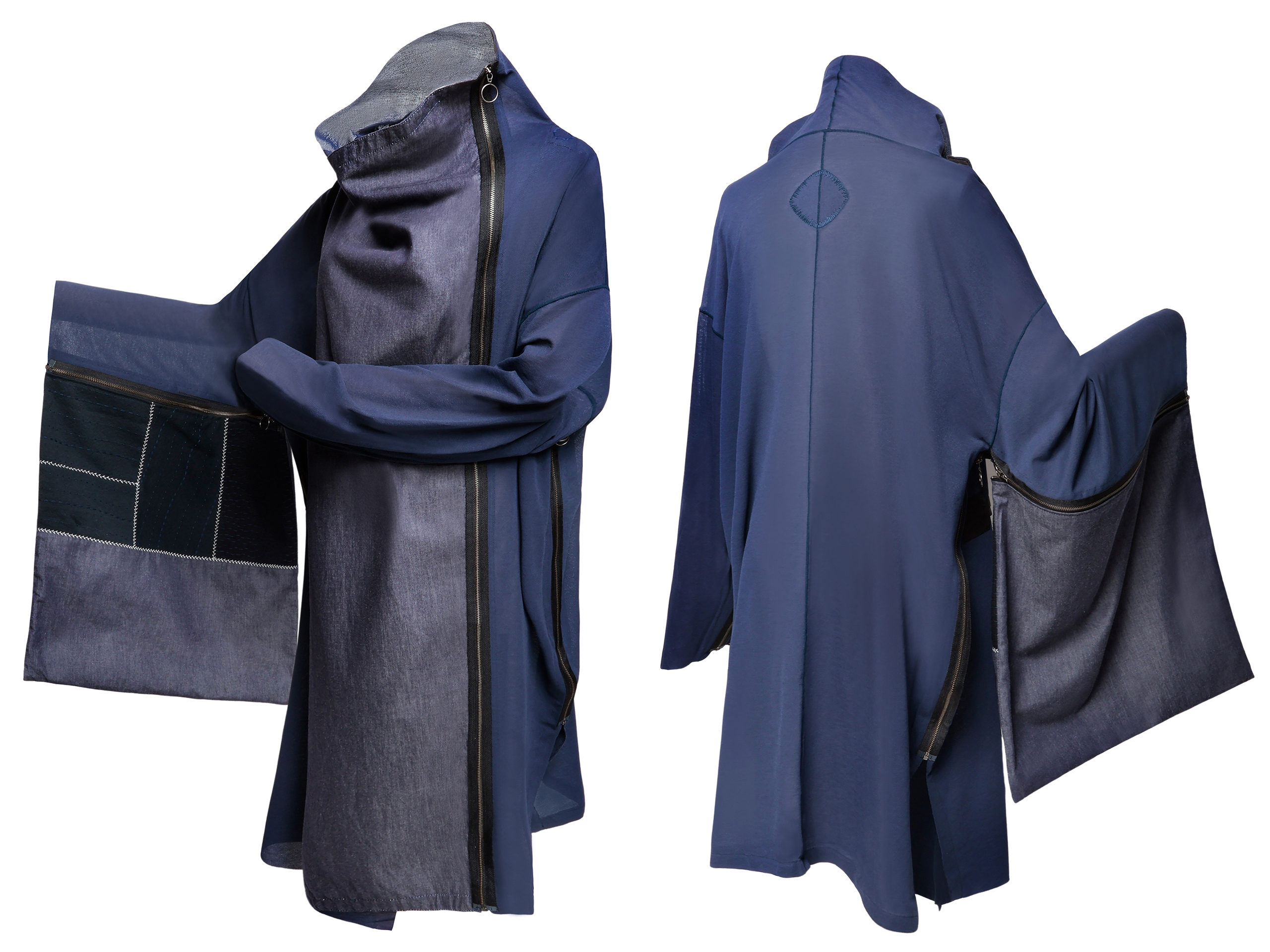 5つのZIPでコート、ブルゾン、ジレ、ストールなど、シーンにあわせて6通りに形を変えられるデザインが特徴。たたむとコンパクトなA4サイズになり、旅行にも便利なアイテムです。取り外し可能なフロントのオプションパネル(別売り)で変化は無限大です。登録意匠。