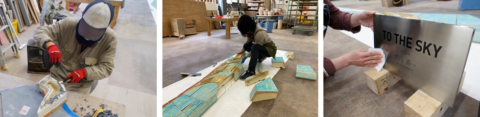 当作品は、2012年に東京スカイツリー開業に合わせてとうきょうスカイツリー駅1階コンコースに設置されました。世界一の高さを誇る電波塔として空へ伸びる東京スカイツリーのイメージと、業平の地に残る日本の伝統的なイメージがひとつに重ねあわされた陶板レリーフ作品で、駅利用者からも広く親しまれてきました。この度、駅付近の約0.9km区間における鉄道高架化のため駅舎移設が行われ、陶板レリーフを製作したクレアーレ熱海ゆがわら工房(静岡県熱海市)による取り外し・修復・保管を経て、新駅舎へ無事に再設置されました。