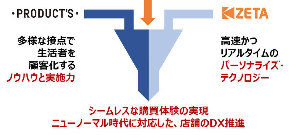 博報堂プロダクツが培ってきた、多様な接点で生活者を顧客化するノウハウと実施力。それとZETAのOMO・DXソリューション「ZETA CLICK」を軸とした、高速かつリアルタイムでCXを向上させるパーソナライズ・テクノロジーが融合することで、生活者がオンライン・オフラインを意識することなく、便利かつ快適に買い物ができる場の提供と、それに対応した店舗のDX化が実現し、クライアントのビジネスに競争力をもたらします。