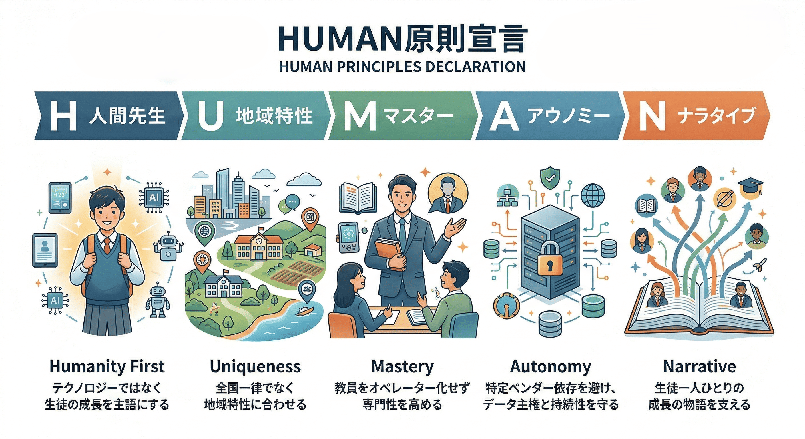 「N-E.X.T.ハイスクール構想は、新しいツールを導入すること自体が目的ではありません。生徒が自ら問いを立て、他者とともに価値を創り出す学びを支え、教師が単なるオペレーターではなく伴走者として専門性を高め、地域の実情に応じて持続的に回る仕組みにしてはじめて、本当の意味での改革になります。だからこそ私は、話題性や便利さだけで判断するのではなく、3年間の総コスト、契約終了後のデータ返却と可搬性、事業者撤退時の継続性、そして学校や教育委員会が最終的に自走できるかまで見通して検討できる道具を公開しました。N-E.X.T.ハイスクール構想を一部の先進事例で終わらせず、各地域で『良い実装』として根づかせるための共通基盤として育てていきたいと考えています。」