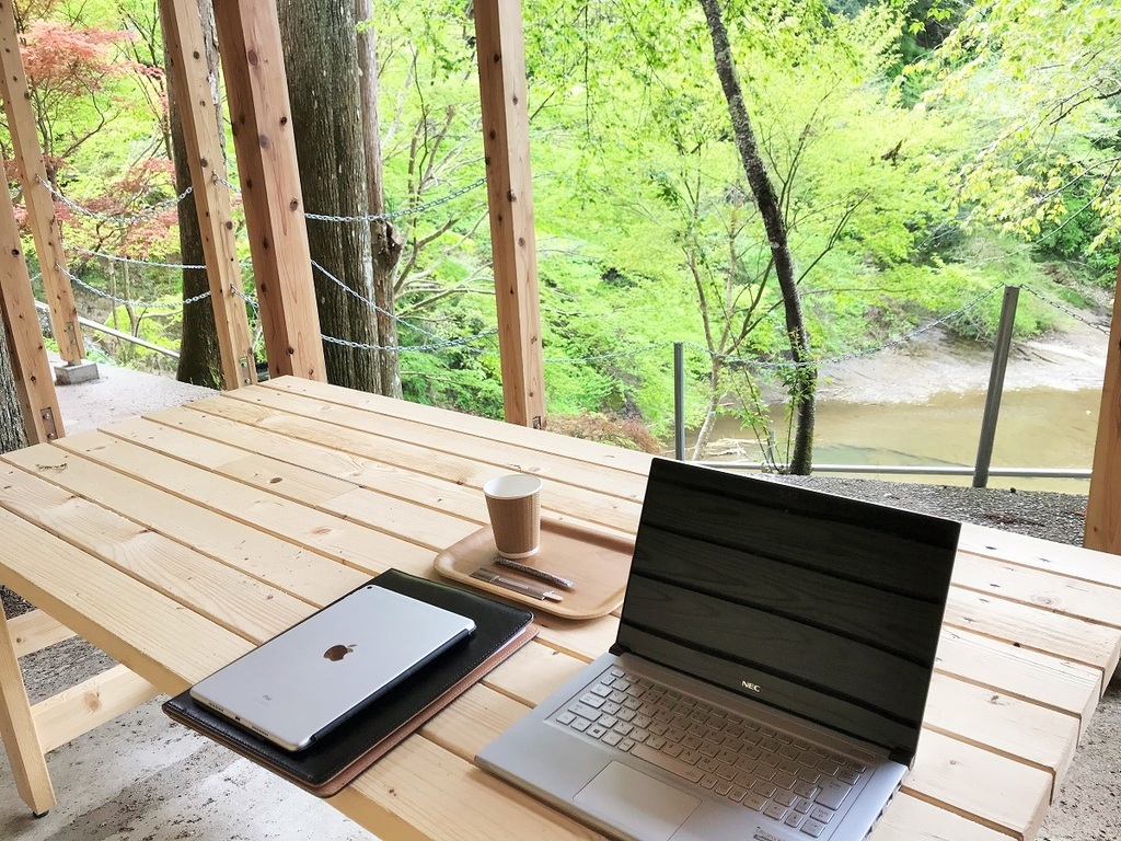 粟又の滝を正面に望む絶好のロケーションに2024(令和6)年にオープンした「滝見テラス」は、開放感あふれるリラックス&ワーケーションスポット。木の香りが漂う全8室の個室テラスには、電源口やWi-Fiが完備されており、滝音や川のせせらぎ、鳥のさえずりをBGMに、非日常的な環境で作業することができます。粟又の滝入口近くにある「秘境の宿滝見苑」が運営しており、テラスでの食事(予約制)や、日帰り温泉が利用できるのも魅力です。