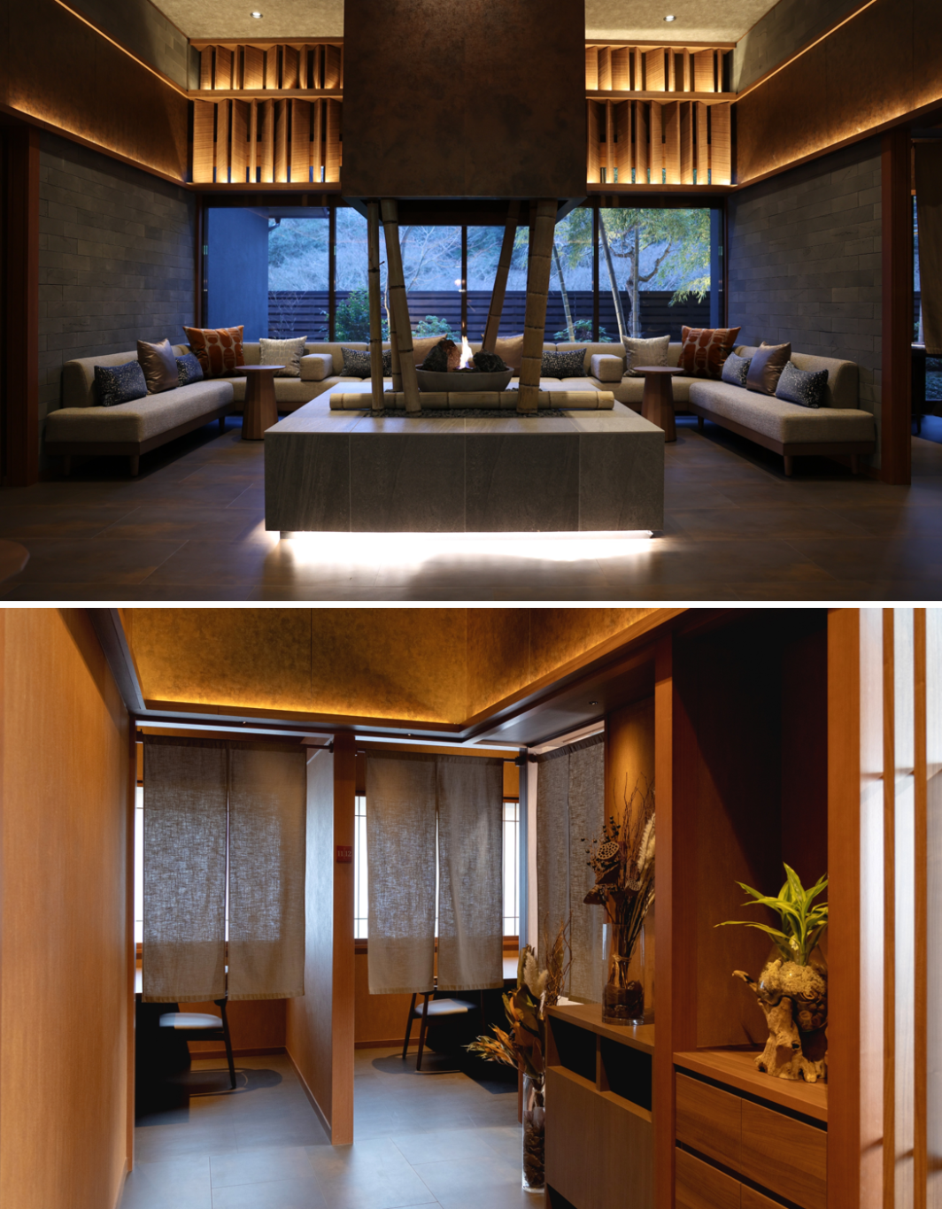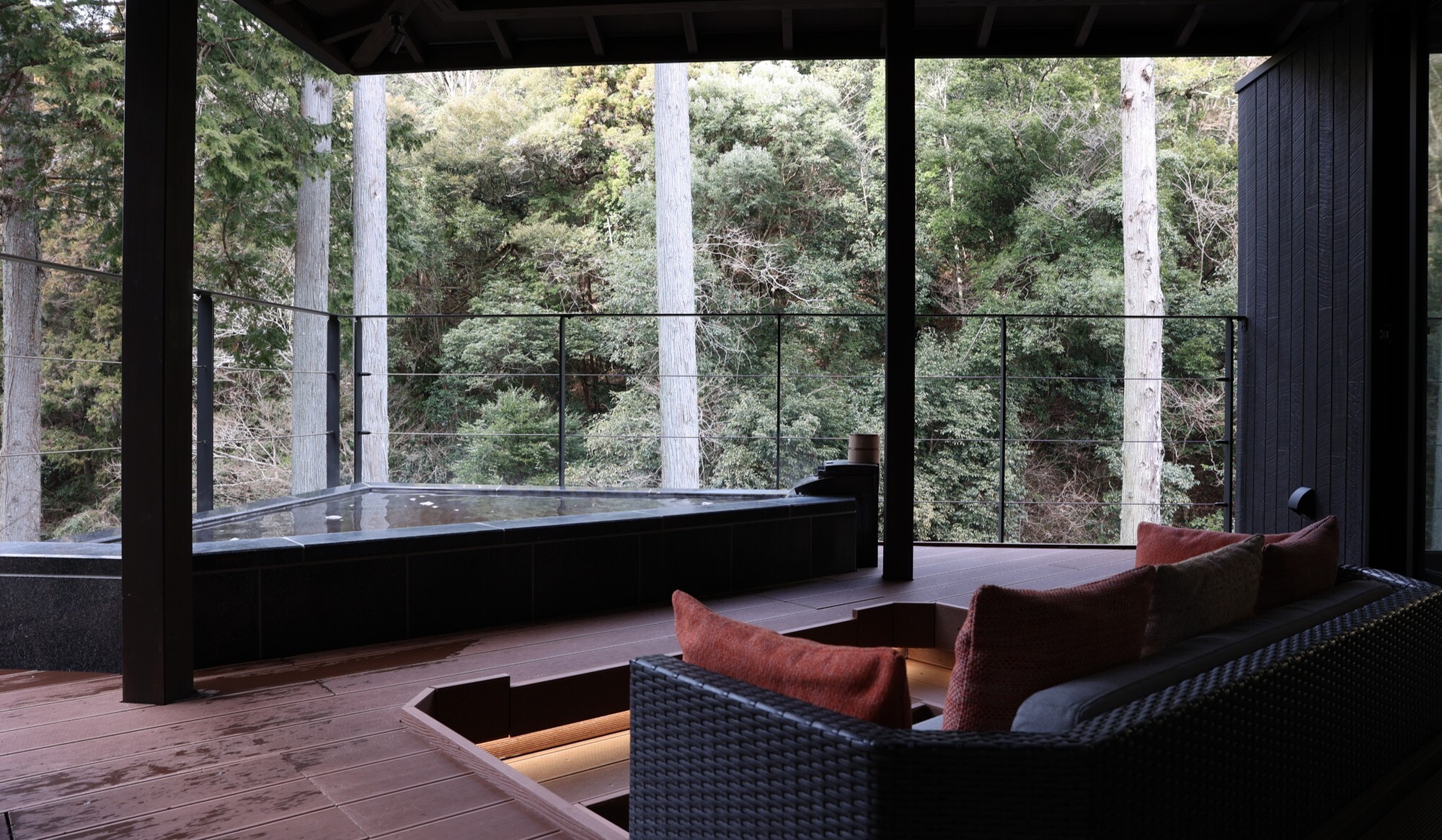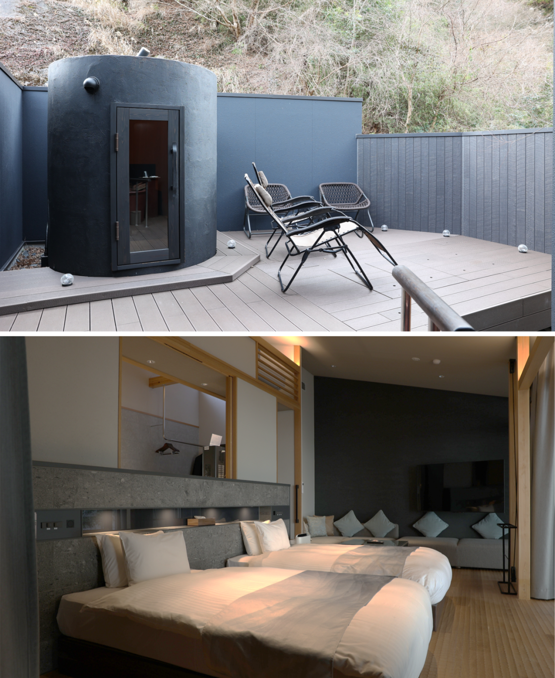 全ての客室に「黒湯」に浸かれる露天風呂を完備。“自然と完全に一体になる滞在”をコンセプトにした、最上級のリバーパノラマルームは、部屋の角2面がガラス張りとなっているのが特徴で、開放感たっぷりです。日本庭園を臨むサウナ付きの貸切風呂もあり、好みの香りでアロマのセルフロウリュを楽しめます。