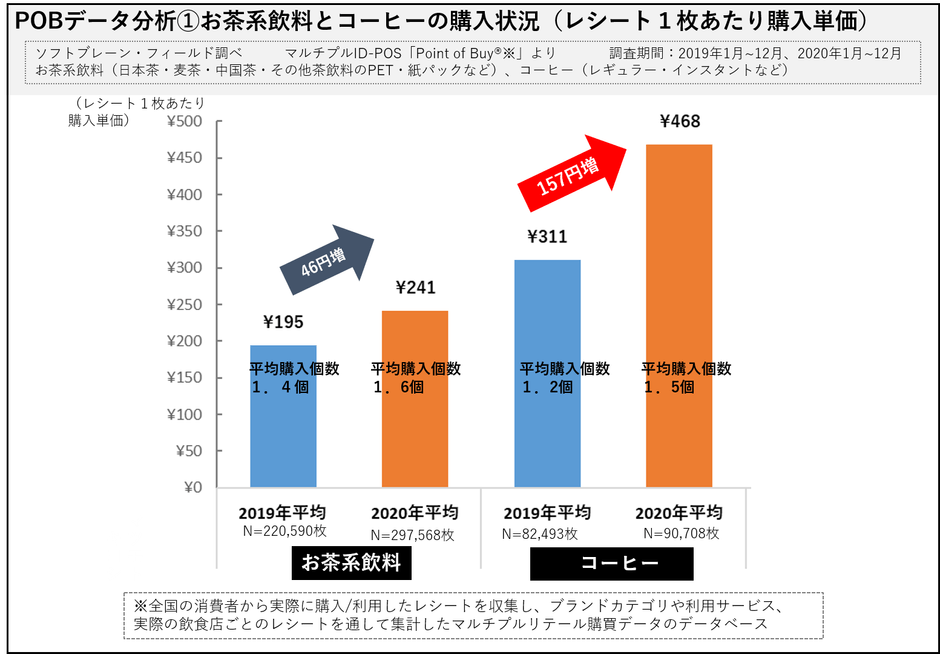 上図は、「お茶系飲料」「コーヒー」におけるレシート1枚あたりの購入状況を19年と20年で比較したものです。平均購入個数に変化はほとんどみられませんでしたが、平均平均購入金額は「お茶系飲料」が、195円から241円に増加し(46円アップ)、「コーヒー」は、311円から468円に(157円アップ)に大きく増加していていることがわかります。