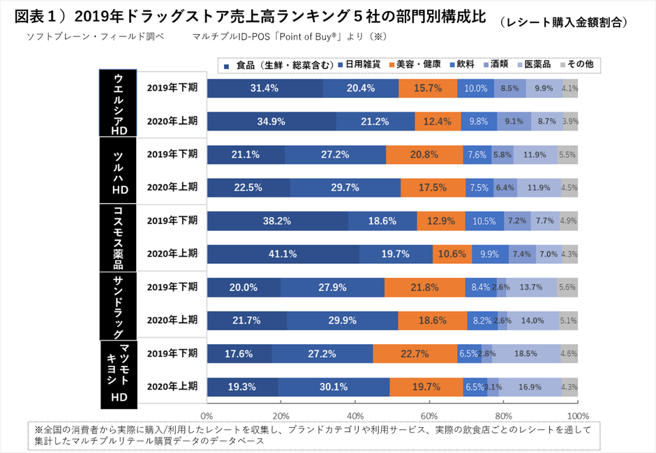 まずは、2019年ドラッグストア売上高ランキング5社「ウエルシアHD(東京都)」、「ツルハHD(北海道)」、「コスモス薬品(福岡県)」、「サンドラッグ(東京都)」、「マツモトキヨシHD(千葉県)」におけるレシートから、部門別構成比を分析しました。