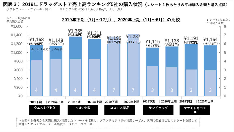 次に、2019年ドラッグストア売上高ランキング5社の購入状況(レシート1枚あたり、平均購入金額および購入点数)を分析しました。