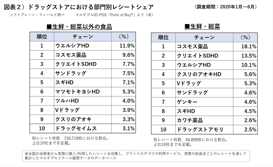 今までの分析結果をまとめると、2019年ドラッグストア売上ランキング5社のレシートにおいて、19年下期と20年上期を比較すると、部門別構成比は、各社「食品部門(生鮮・総菜含む)」が、増加傾向で、唯一コスモス薬品のみ、およそ4割を超えていました。食品構成比を高めにし、医薬品や化粧品などの構成比を低めに抑える売り方や、郊外立地の戦略が、コロナ禍でも日常的な集客に寄与し、好調であったと考えられます。
