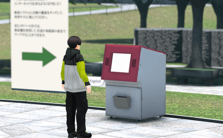 メタバースでは、スマートフォンやパソコンのブラウザからアクセスし、アバターを操作してバーチャルの公園内を散策できます。「おじいちゃん・おばあちゃんの名前を孫に見せたい」「海外から故郷の礎を訪れたい」といったニーズに応えます。