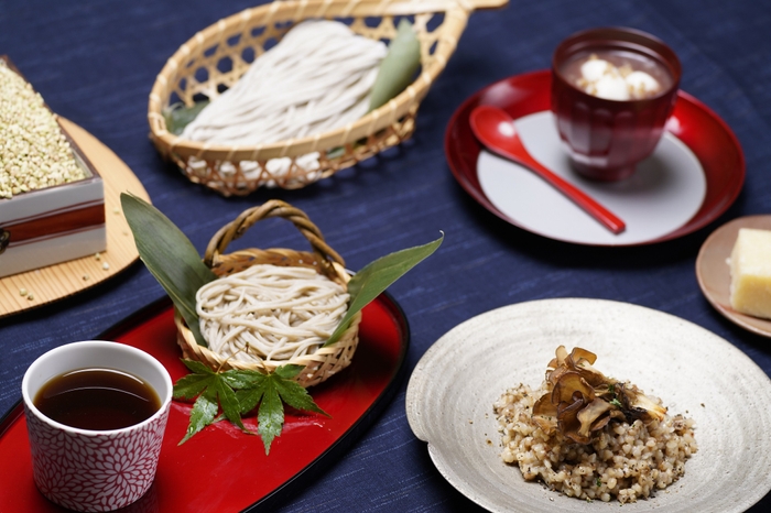 「手打ちそば」「そばの実とキノコのリゾット」「そばぜんざい」