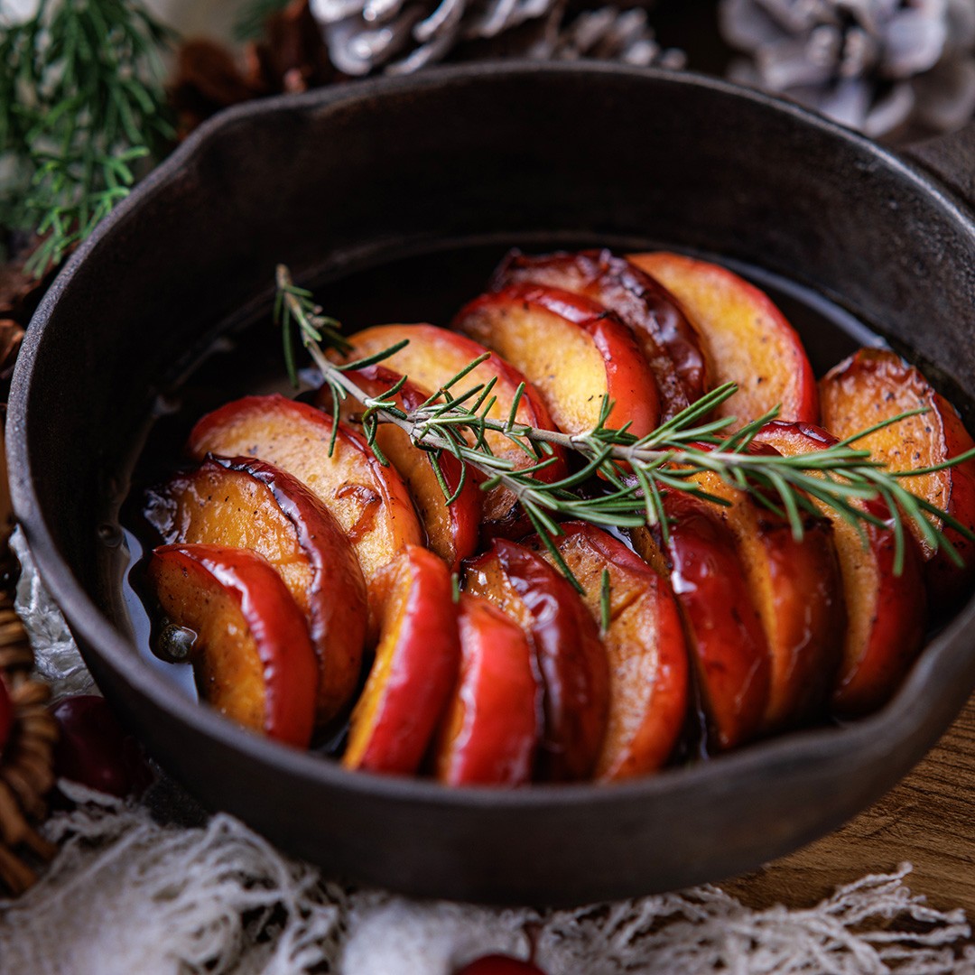 チーフペストリー・シェフ 内藤隆のスイーツは、じっくりとキャラリゼしたリンゴにローズマリーの香りを添えた「リンゴのキャラメリーゼ煮 ローズマリー」や、アーモンドの香ばしさとショコラの風味が広がる、フランス・ロレーヌ地方に伝わる伝統菓子「ガトー・ショコラ ナンシー」など、フランス修行時代に培った技術を余すことなく表現。
